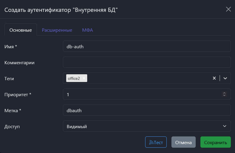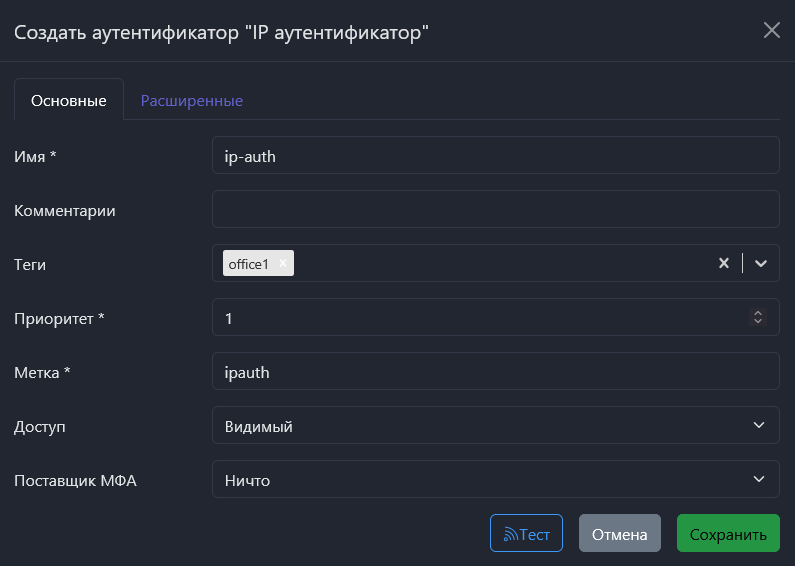 https://10.10.10.10/#/login/radius, гдеradius– значение метки - Отключен – аутентификатор не будет отображаться как доступный в форме авторизации пользователя, также его невозможно использовать для аутентификации