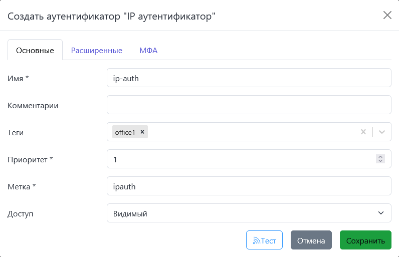 https://10.10.10.10/#/login/ipauth, гдеipauth– значение метки - Отключен – аутентификатор не будет отображаться как доступный в форме авторизации пользователя, также его невозможно использовать для аутентификации