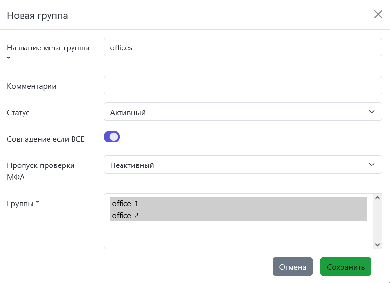 - при отключении: пользователь должен принадлежать всем группам из метагруппы, чтобы считаться принадлежащим метагруппе. Иначе он не будет отображаться в списке пользователей метагруппы