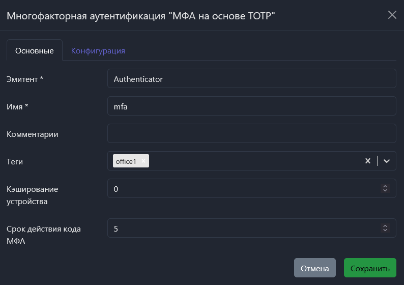 - Срок действия кода МФА – время в минутах, в течение которого будет действителен код