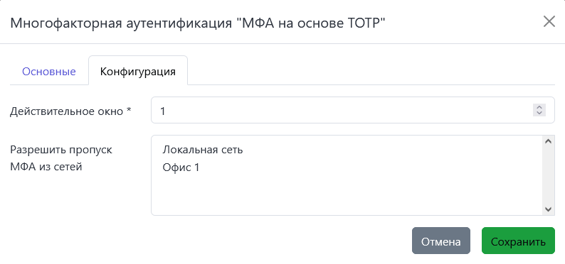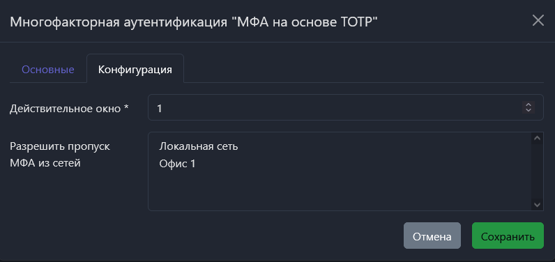 - Разрешить пропуск МФА из сетей – выберите сети, заранее созданные в разделе Подключение → Сети, из-под которых не будут запрашиваться одноразовые коды