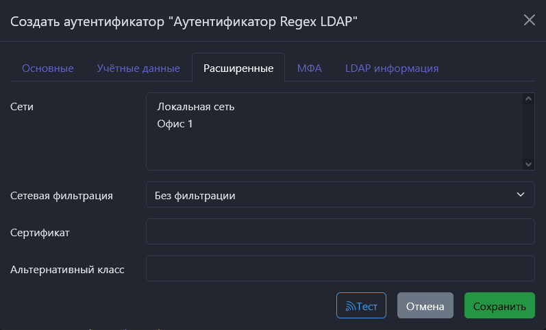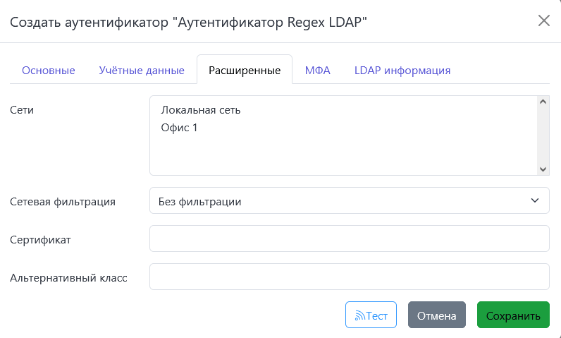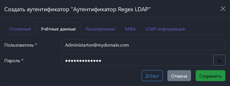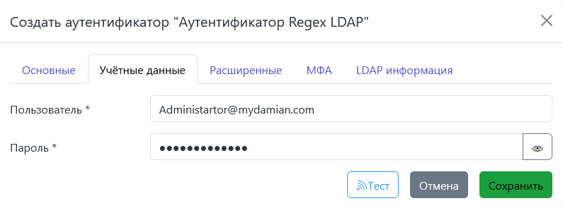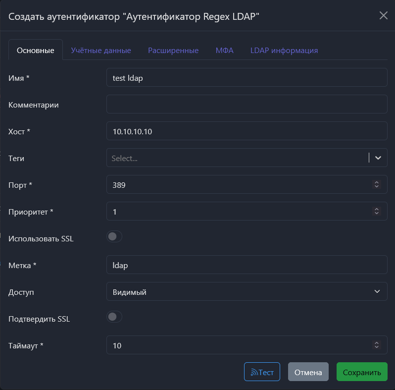 https://10.10.10.10/#/login/ldapauth, гдеldapauth– значение метки - Отключен – аутентификатор не будет отображаться как доступный в форме авторизации пользователя, также его невозможно использовать для аутентификации