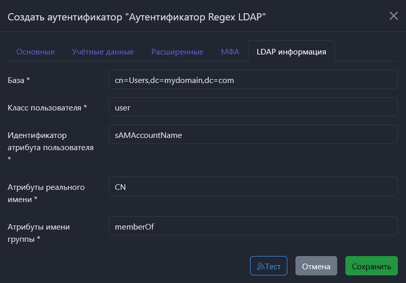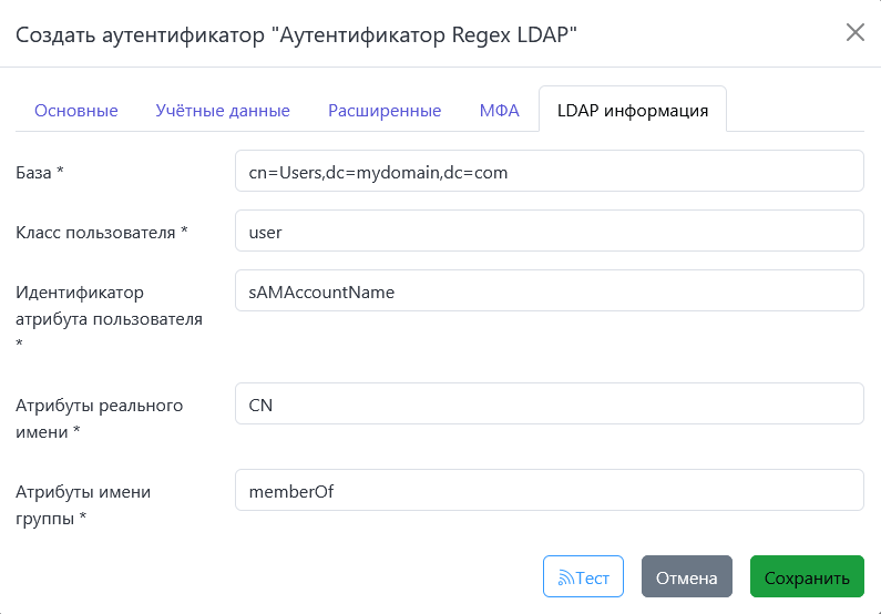 - Атрибут имени группы* – атрибут LDAP, определяющий членство пользователя в группе. Для определения различных атрибутов группы (по одному в каждой строке) могут быть указаны различные атрибуты. Он также позволяет использовать регулярные выражения для извлечения или составления определенных значений
