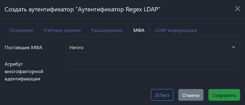 - Поставщик МФА – данный тип аутентификатора поддерживает многофакторную аутентификацию. Поставщик МФА настраивается в разделе Аутентификаторы → МФА