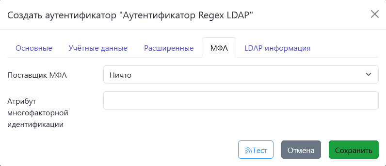 - Поставщик МФА – данный тип аутентификатора поддерживает многофакторную аутентификаци. Поставщик МФА настраивается в разделе Аутентификаторы → МФА