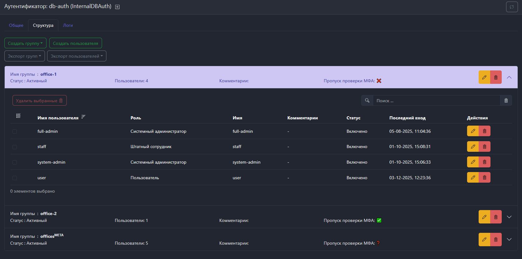 В данном разделе описаны порядок создания и настройки аутентификаторов, групп, пользователей и метагрупп, порядок входа пользователей с разными типами аутентификаторов, процесс управления пользователями. Также описаны роли пользователей и порядок настройки многофакторной аутентификации.