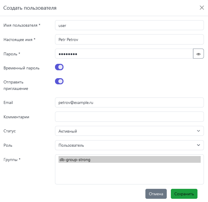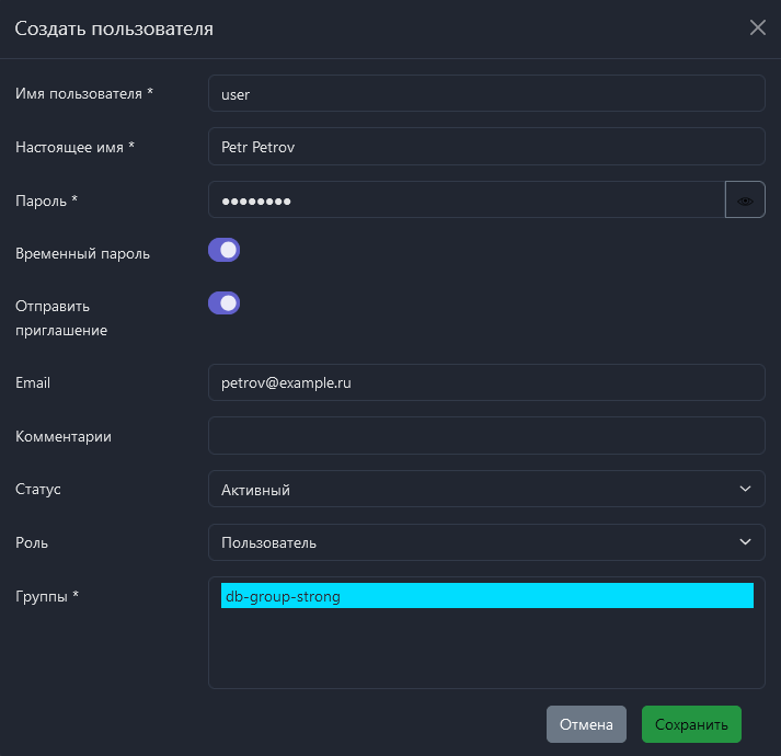 Имя пользователя, группа, к которой принадлежит пользователь, и его роль недоступны для редактирования
