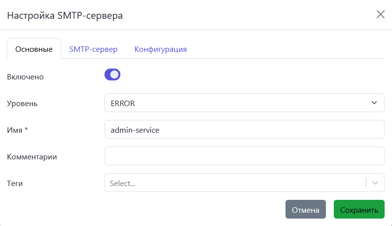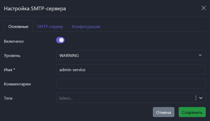 В разделе Инструменты → Уведомления настраиваются SMTP-сервера, предназначенные для отправки уведомлений администраторам о событиях в системе и для служебной рассылки пользователям.