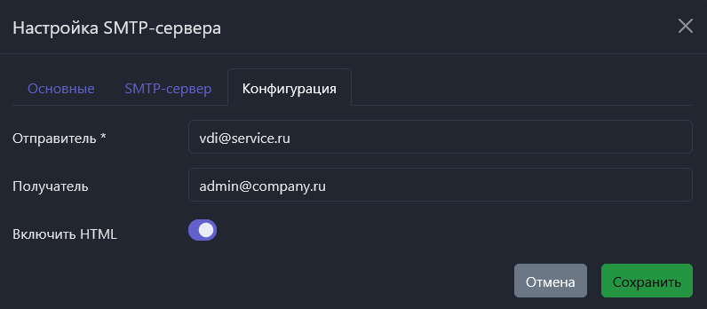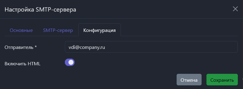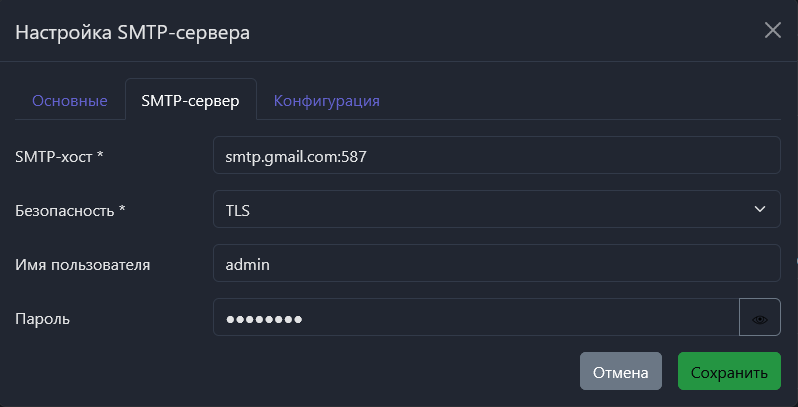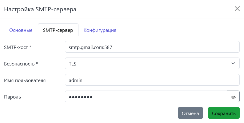 - Пароль – пароль пользователя с доступом к SMTP-серверу