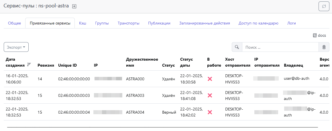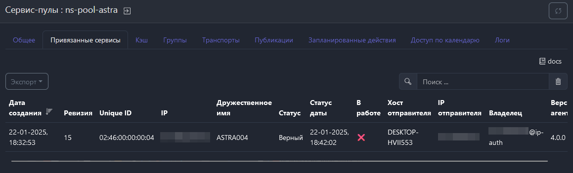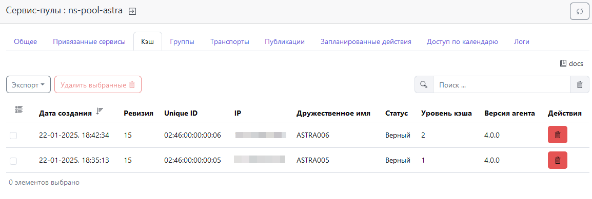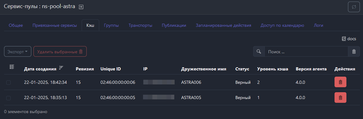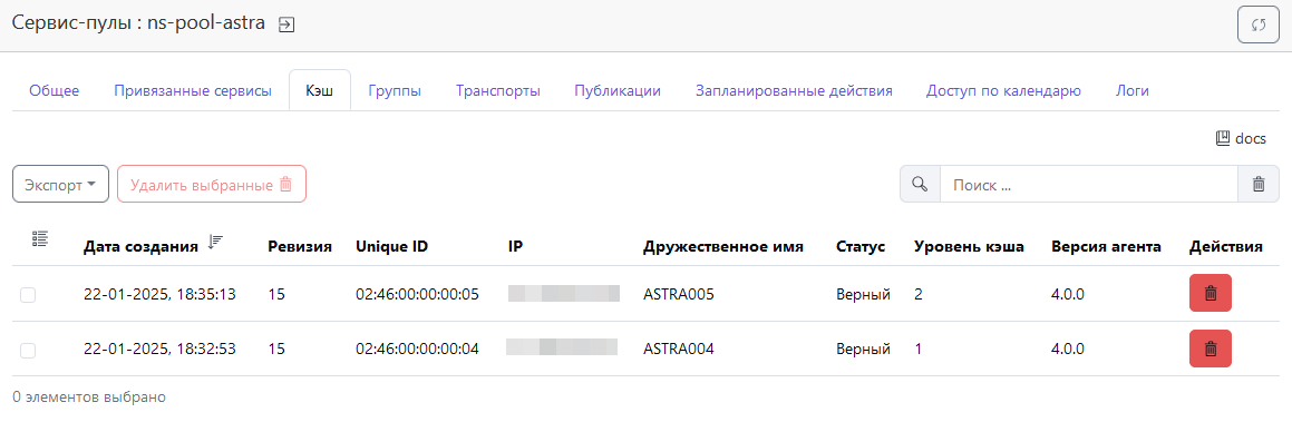 Изначально все опубликованные пользовательские сервисы будут отображаться в Сервис-пулы → Публикации → Кэш