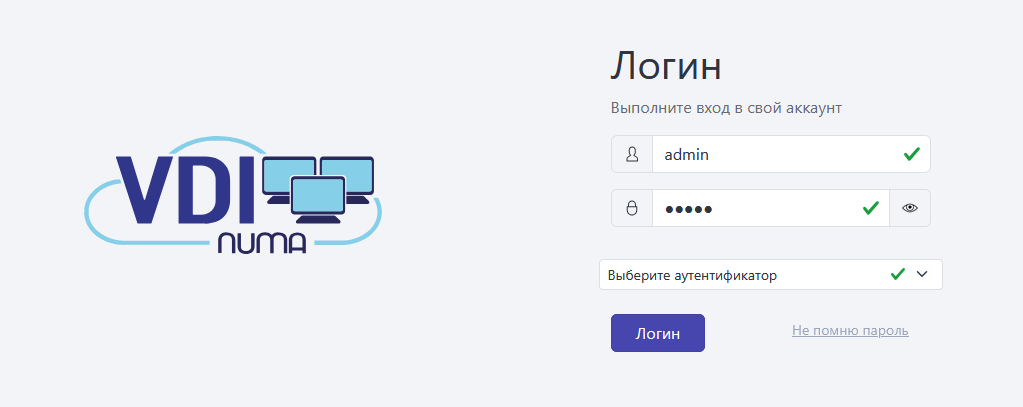Для входа в Numa VDI введите логин, пароль и выберите свой аутентификатор из списка (только при наличии более одного аутентификатора).
