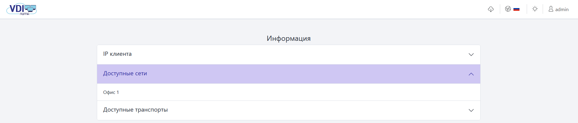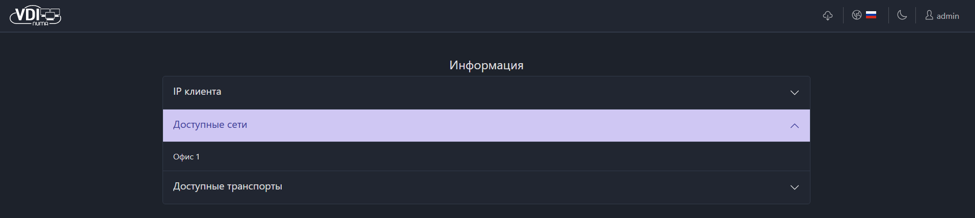 После успешной авторизации отобразится панель Информация со сведениями об IP-адресе текущего пользователя, настроенных сетях и транспортах.