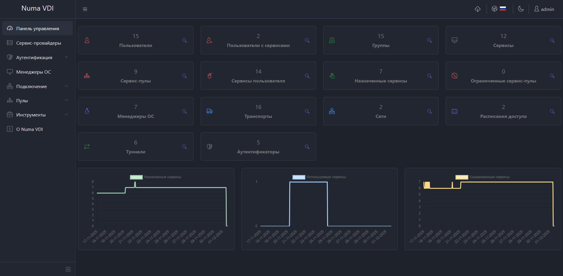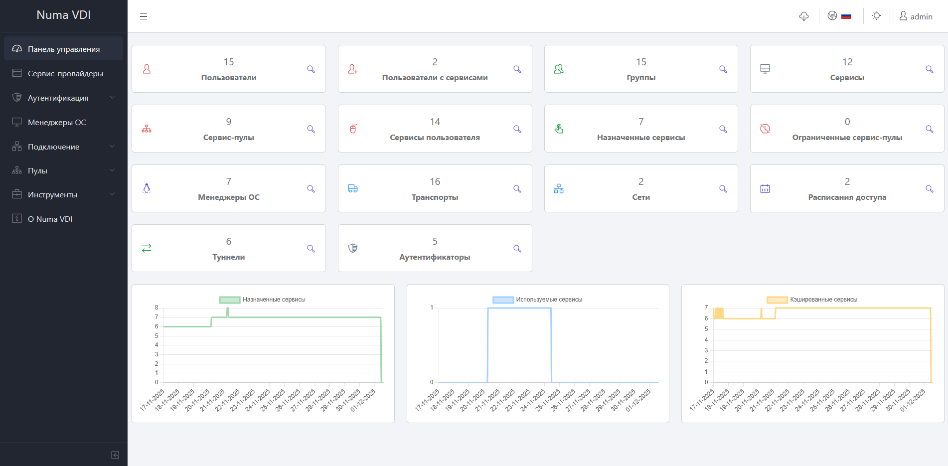 В панели управления Numa VDI выполняется первоначальная настройка элементов инфраструктуры, которые будут формировать Сервис-пулы, а именно Аутентификаторы (в том числе Группа пользователей, Пользователи), Сервис-провайдеры (с сервисами по разворачиванию виртуальных рабочих столов, сеансов виртуальных приложений), Менеджеры ОС и Транспорты. Это позволит развертывать пользовательские сервисы для дальнейшего подключения к ним.