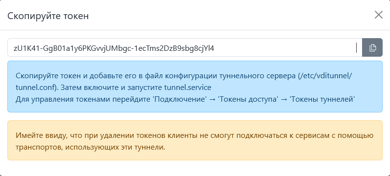После настройки туннельного сервиса создайте транспорт с туннельным подключением. После подключения пользователя к пользовательскому сервису токен туннельного сервера отобразится в Подключение → Токены доступа → Токены туннелей.