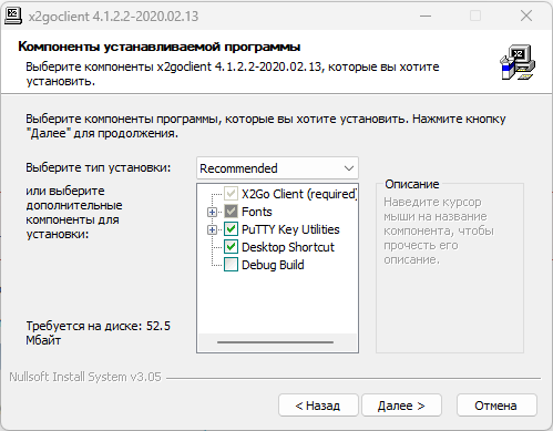 Скачайте клиент на официальном сайте X2Go и выполните установку, выбрав тип установки Recommended