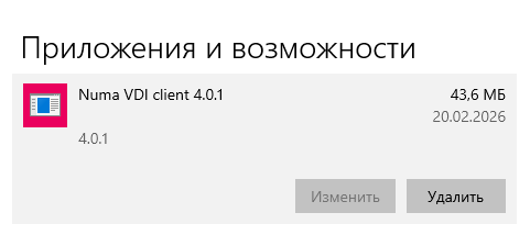 Способ №1. Откройте меню «Приложения и возможности», в списке найдите «Numa VDI client» и нажмите «Удалить». Подтвердите удаление.
