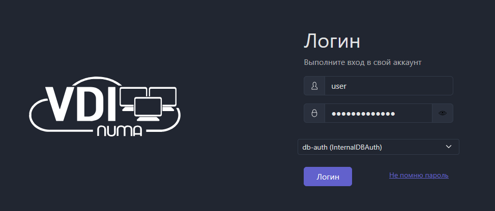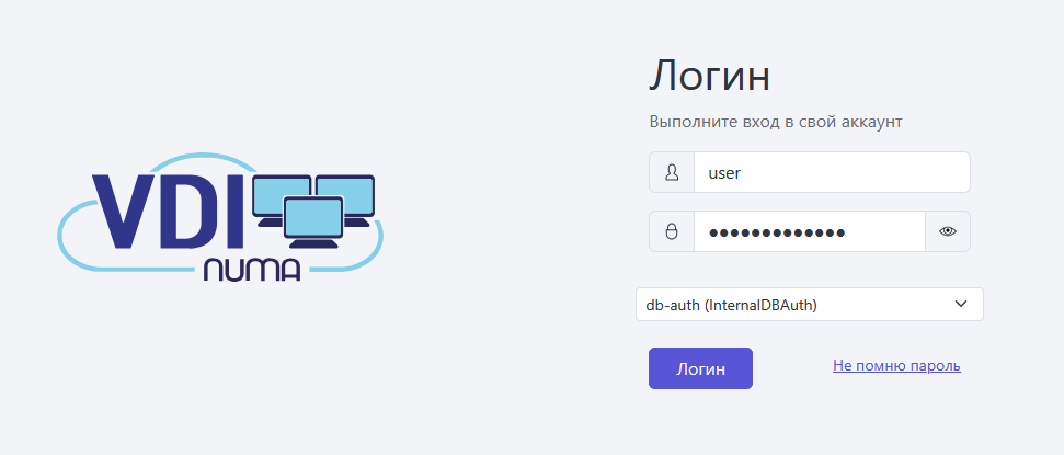 Получите данные для авторизации (логин/пароль/аутентификатор) у администратора Numa VDI или на электронную почту и войдите в свой аккаунт.